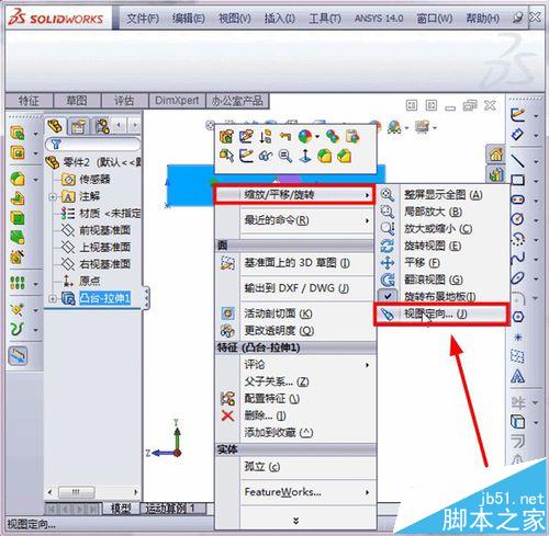 4、现在要将红色的面“垂直正视”,要如何操作呢?首先:选择红色面,右键,选择“缩放/平移/旋转”选项,再选择“视图定向”,如图所示