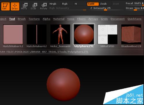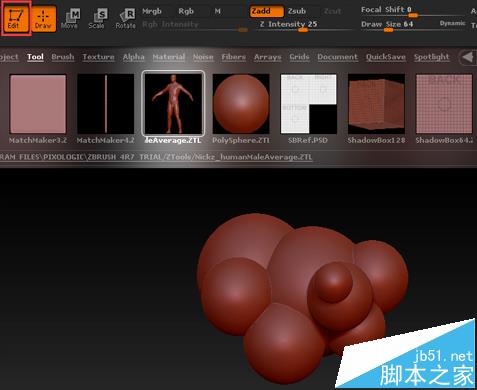 1、打开ZBrush软件,随意找到一个模型,Tool菜单下的PolySphere.ZTL在画布位置任意拖拽多次,得到如图所示的效果