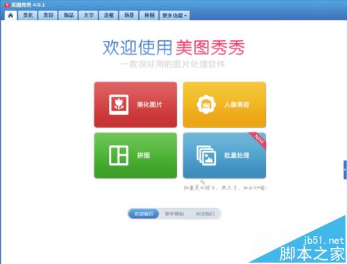 1、打开美图秀秀这款软件,进入美图秀秀的操作界面,如图所示: