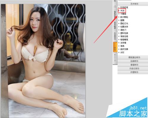 6、点击PS特效后,进入PS特效的操作界面,在这个界面的上面找到木刻选项,如图所示: