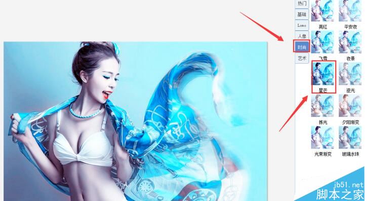 在编辑界面内找到时尚选项,并在时尚选项的选择区域里找到星芒选项,如图所示: