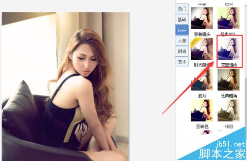 7、点击蓝色泪雨选项,我们的图片自动添加该效果,然后再找到时尚选项,在时尚的选择区域里找到夜景选项,如图所示: