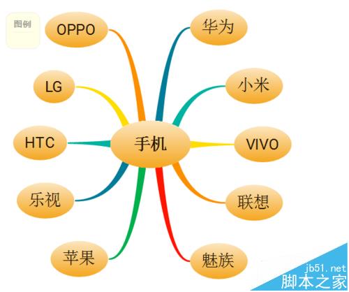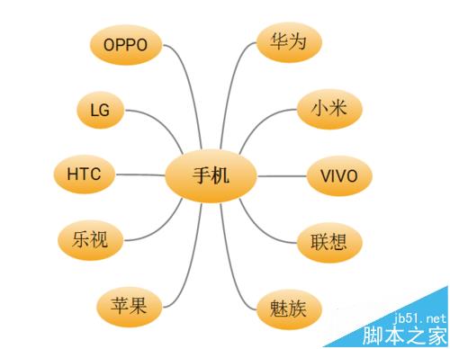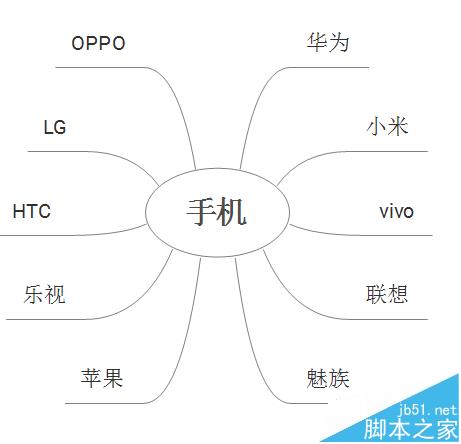 XMind软件是思维导图工具,其中有思维导图、平衡图、组织机构图、树状图、逻辑图、鱼骨图和矩形。新建的空白图中常用的是思维导图,而每种图形有各种设计风格,下面利用图形设计手机品牌关联图,如下图,具体操作如下: