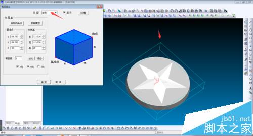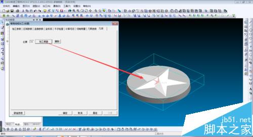 1、首先打开模型文件,这里以前面绘制的曲面五角星为对象。将设计树调整到轨迹栏。设置工作毛坯形状和大小,这里直接参照模型,形状为矩形,如图所示。