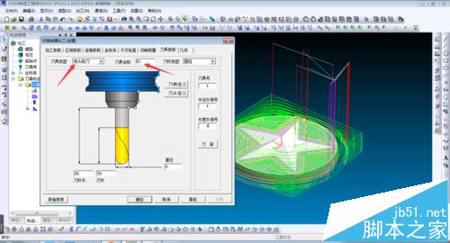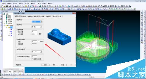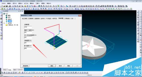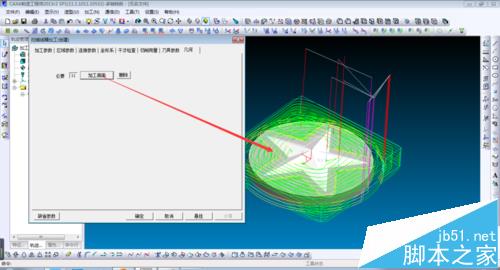 6、在刀削参数中设置相关数据,具体参数如图,可根据实际材料进行相应数值调整。几何切削曲面全选部件,确定后生成刀路,如图。