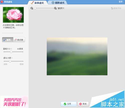 7、现在我们开始背景虚化,我们看到有两种虚化方式,我们选择“涂抹虚化”,我们点击鼠标左键涂抹出图片清晰的区域,如图所示
