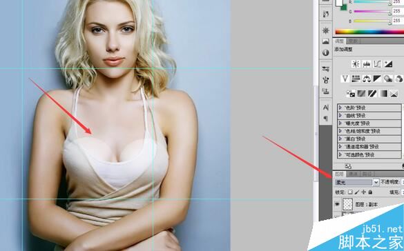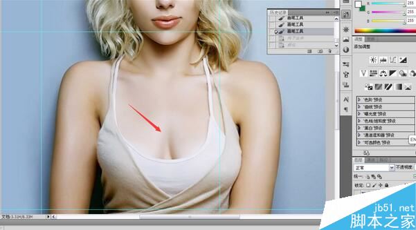 这个时候对比一下原图,胸部已经有了比原先较挺 立的效果。这个时候问题又来了,如果胸部变大了,那么沟,是不是该更深一点呢?
