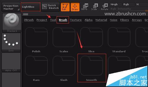 1、首先找到要增加光滑笔刷强度的具体位置:单击Lightbox[灯箱]按钮,接着在下挂菜单栏中点击Brush[笔刷]菜单,找到Smooth[光滑]文件夹并双击打开。