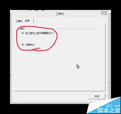 5、在工具栏窗口中点击“选项”,还可修改工具栏“在工具栏显示屏幕提示”这个是当你把鼠标移动到任意工具时,会显示出它的名称和简单的作用。建议新手勾选该选项。还有一个改变工具图标大小的。