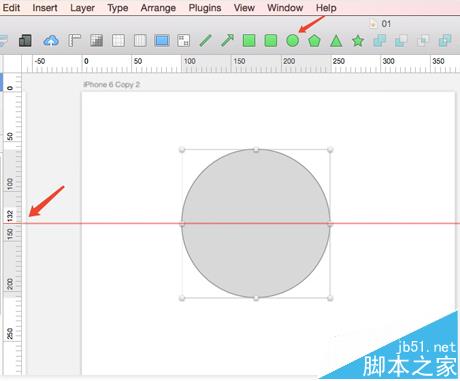 2、选中圆形工具在画板上画一个正圆,横坐标参考线沿着标尺边缘移动到圆形中间的位置点击一下,参考线就出来了。