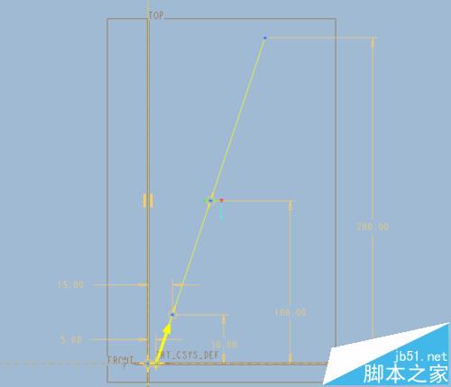 3、绘制一条中心线、一个斜线,并在斜线上取两点,其尺寸关系如下图;