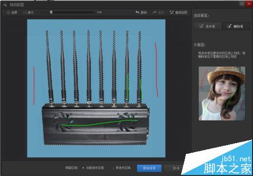 1,这种方法就很实用,也很好操作。用选中笔(绿色的线)选中需要的部分,删除笔(红色的线)选择不需要的区域,这样很智能就将自己想要留的东西选定了。