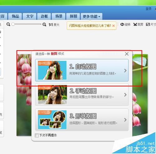5、在抠图笔的选项设置中,我们推荐大家使用“自动抠图”模式,在自动抠图模式中,我们仅仅需要在要抠图的图片范围内随便划上两笔,软件将自动根据图片的形状进行抠图,非常简便实用,可以说是傻瓜式操作。