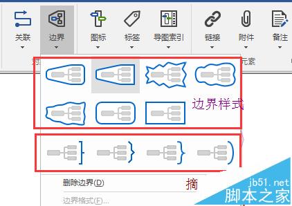 1、MindManager 16中的边界工具,在开始中的“边界”,选中要添加外框/边界的主题,然后点击“边界”下的下拉箭头,选择合适的样式,摘要也是属于边界样式的一种。