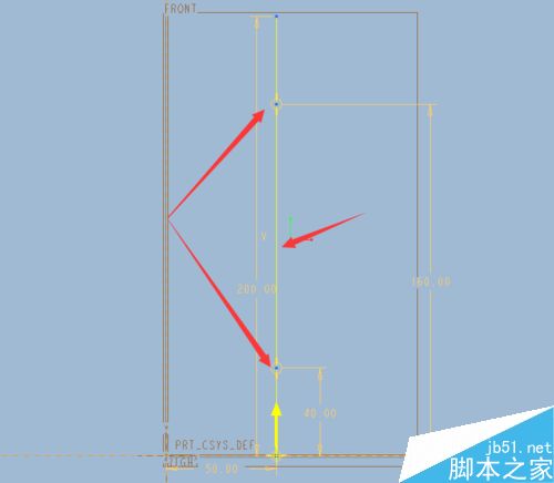 4、按软件的操作提示,进入到草图界面,绘制一中心线及一条路径线(竖直的线),由于我们要使用可变螺距,记得要在路径线上画点,如图,我是在线上增加了两个点;(此步非常的重要,此两点是输入可变螺距的点)
