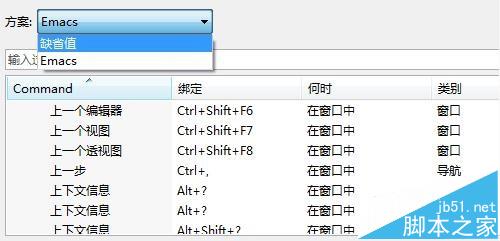 2、打开首选项对话框,点击快捷键选项,出现快捷键设置窗口。在方案中,祖选择快捷键设定的参照规格,缺省值是指XMind系统自身设定的规则,而Emacs则是宏编辑器的参照规则,用户可根据自己的习惯选择。