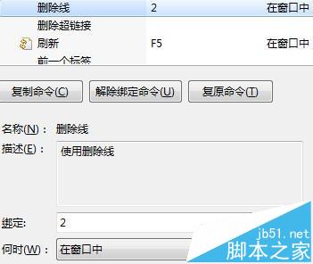 3、选择好后,在下方的窗口中选定想要设置快捷键的操作,鉴于操作较多,用户可以通过上方过滤对话框输入进行详细查找。举例,我想要设置“删除线”的快捷键,选中删除线选项后,在下方的板块中,可以看到删除线的描述,在绑定对话框内,输入想要绑定的命令,如数字键2,在何时窗口中,选择执行快捷键的时间条件。