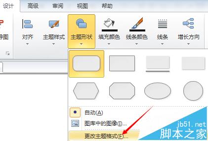 2、在设计选项卡上,点击对象格式对话框启动器,或者点击主题形状箭头,选择主题格式;