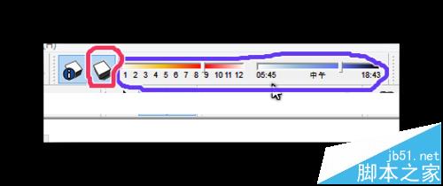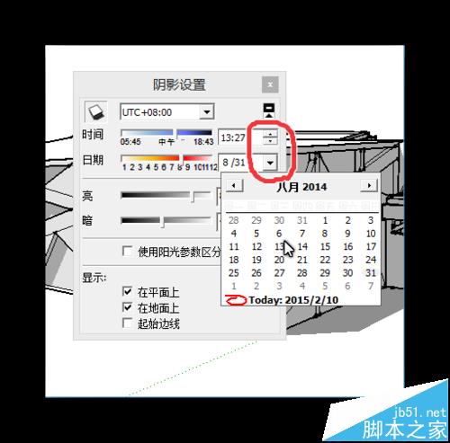 2、勾选了之后就会弹出阴影的工具栏,用红圈画出来的是阴影的开关按钮。用蓝圈画出来的是用于调整时间的,分别是调整月份,和上下午的。