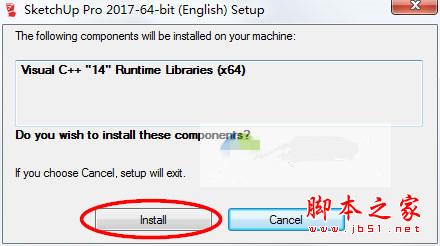 1、解压安装包,运行“setup.exe”开始安装SketchUp Pro 2017,软件会自动检测必备项目,点击Install