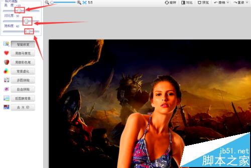 16、在这个编辑界面内,调节亮度为-10,对比度为30,饱和度为40,如图所示: