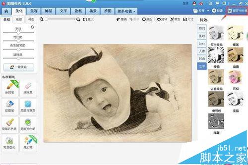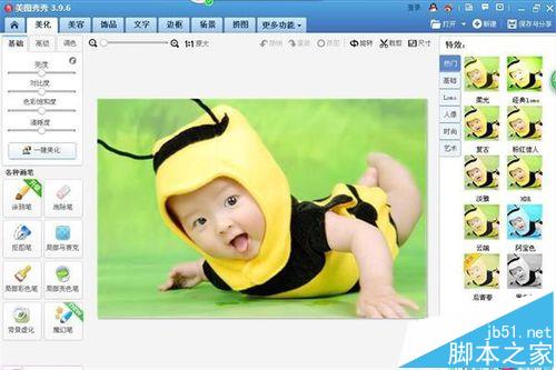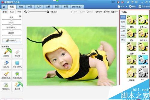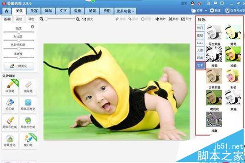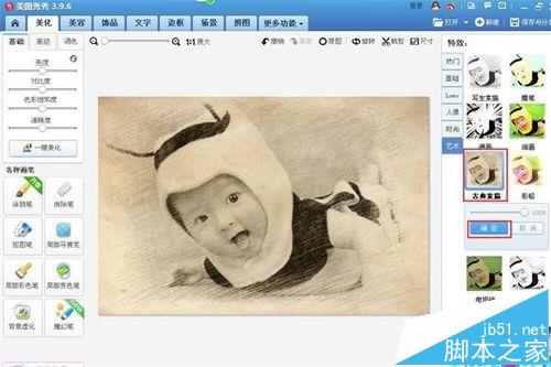 4、我们现在要把这张彩色照片制作成古典素描的图片,我们在“美化”图片的页面右侧看到有“特效”窗口,如下图所示