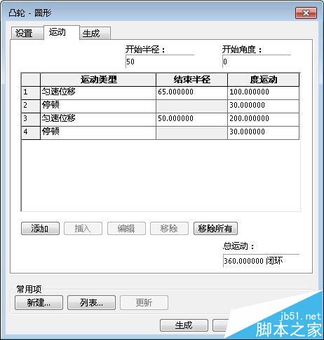 3、下面点击选项卡的第二页“运动”,按照本次示例的数据填写相关内容。开始半径跟前面一样填写50,开始角度跟前面一样填写0.