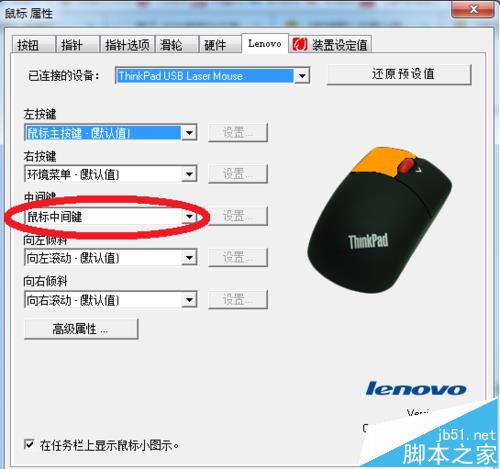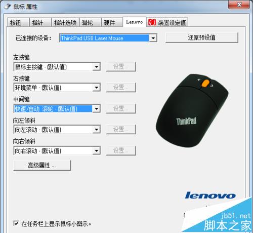 2、我的鼠标是联想的,点击排在鼠标硬件属性后“Lenovo”,看到“中间键”的属性是 快速/自动 滚轮默认值,在此处选择下来选项里的“鼠标中间键”,保存,回到草图大师Sketchup界面,按下鼠标中间滚轮时,已变回旋转选项。问题解决。