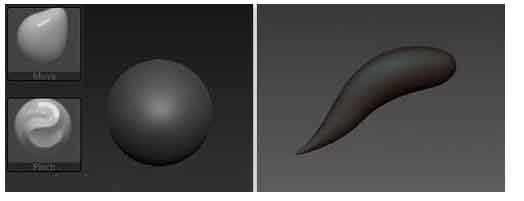 1、在Tool工具面板上,插入球体并在工作区拖拽鼠标绘制,单击“Edit”进入编辑模式,单击“Make PolyMesh3D”按钮,为了方便观察,您可以更换材质。使用“Move [移动]”笔刷来获得所需的形状,切换至“Pinch [捏挤]”笔刷,收缩模型的表面,将边缘逐渐捏尖,如下图所示。