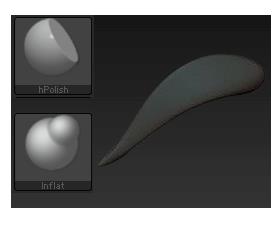 2、使用“hpolish”笔刷来刷出两侧和根部的头发部分,为了体现头发质感有软硬变化,就用这个笔刷塑造一些稍微硬、平整一点的效果。使用“Inflat”笔刷让头发从根部开始饱满起来,并确保它逐渐变薄。