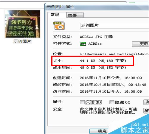 查看选定照片的内存,如下图,小编选的示例图片内存大小是44.1KB.
