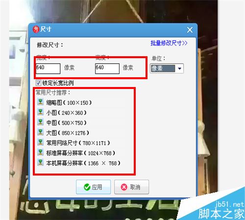 选择尺寸,你可以直接将在推荐尺寸中选择,或者自己输入尺寸,尽可能将照片尺寸缩小,完成后选择应用。