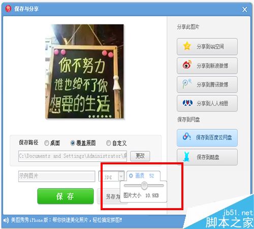 在弹出的保持对话框中,调整画质,将画质稍微调小有点,当然如果照片要求比较高的话不要调太小哦,因为调太小会影响照片的质量。