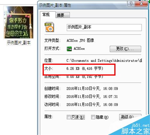 保存后,选中照片,单击右键属性,查看修改后照片的内存,大小只有6.26KB,是不是缩小了很多呢。