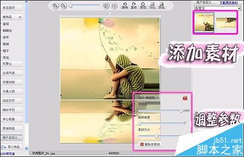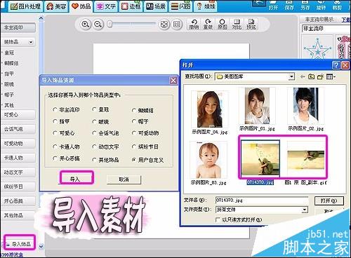 5、然后进入“饰品”菜单下,将原图和倒影的图片导入到“用户自定义”中。
