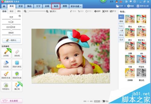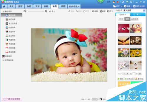 5、我们现在想把这张图片放到一个特定的场景里,那么我们就在“美图秀秀”的页面菜单中找到“场景”,如下图所示