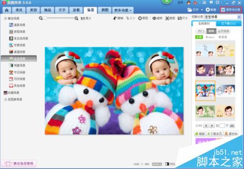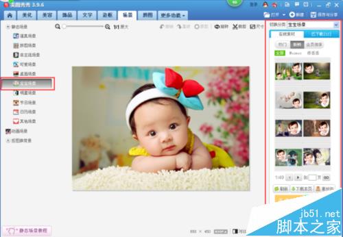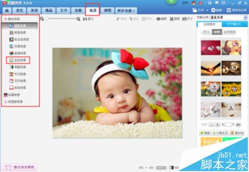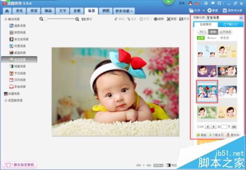 8、我们点击“宝宝场景”,在“场景”的页面右侧视图中我们看到弹出了“宝宝场景”的素材窗口,如下图所示