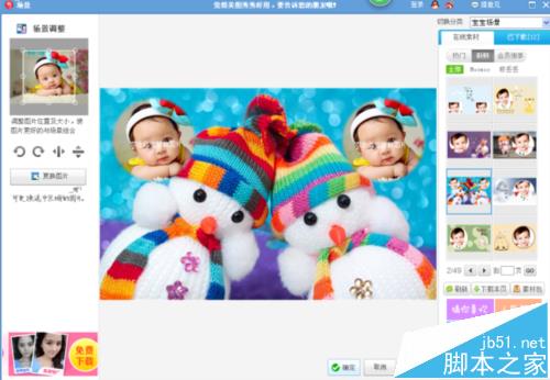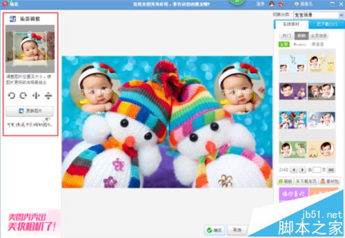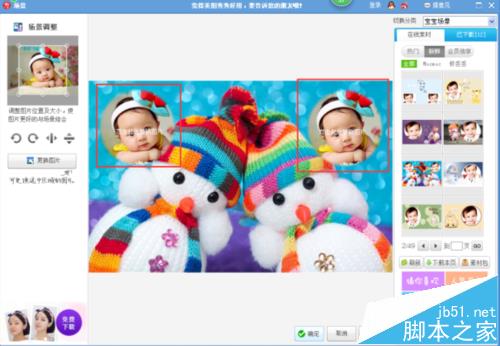 9、我们在“宝宝场景”的"在线素材"窗口中找我们想要的场景,我们看到素材显示有1/49,就是说现在有49页素材可供我们选择,如下图所示