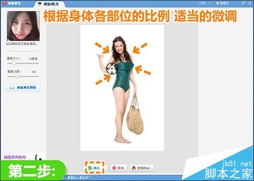 1、在“美图秀秀”软件下,进入“美容”菜单下选择“瘦身瘦脸”功能,用合适的画笔大小力度,将身体微胖的部位向内推。