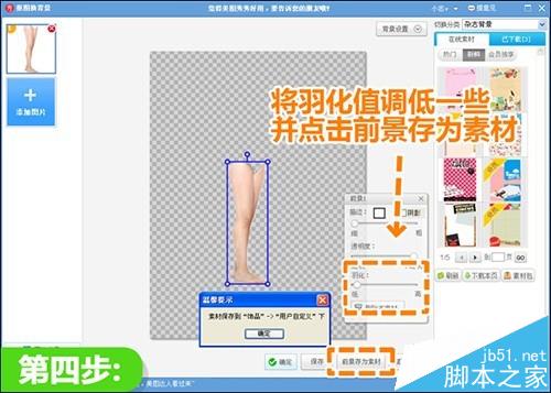 4、跳转到新界面后,将抠图素材的羽化值调低一些,然后点击“前景作为素材”,将抠图素材存入“饰品-用户自定义”中备用。