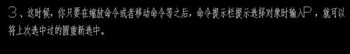 1)选择之前选择的物体:在删除、复制、移动、旋转、拉伸、选择、缩放等命令下使用,输入命令P,表示重复上一次的选择命令。