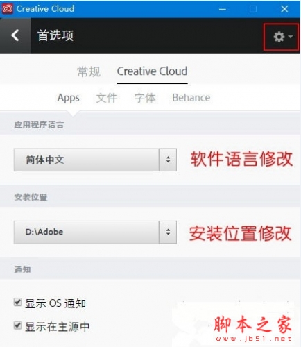 打开Creative Cloud,在偏好设置里面可以修改软件安装语言和安装位置,如果有些软件没办法在安装之后切换语言,可以在安装之前设置一下,然后安装。