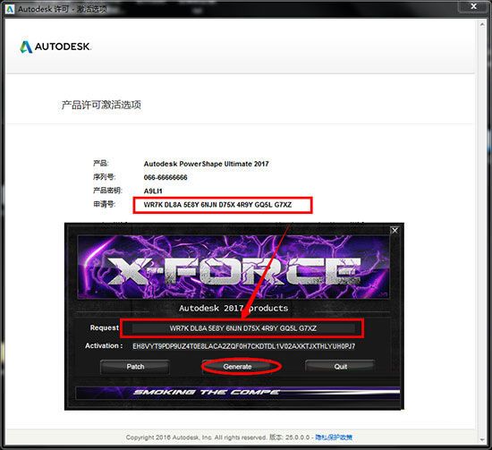 8、将“申请码”复制到注册机的第一项中,点击“Generate”,生成激活码