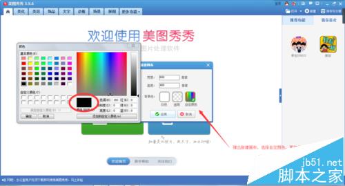 2、首先我们先打开美图秀秀。点开‘新建’,一般在右上角,弹出‘新建画布’窗口,选择自定义颜色,黑纯色