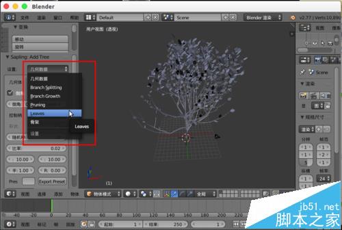 6、顶部的“设置”中勾选各个选项,就可以对树木的枝干树叶等进行细部的设置,完成自己需要的树木模型。