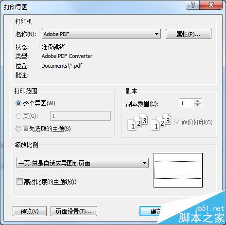 3)选择打印机为Adobe PDF(也可以是其他安装的PDF虚拟打印机),然后根据个人需求,设置“缩放比例”及其他。