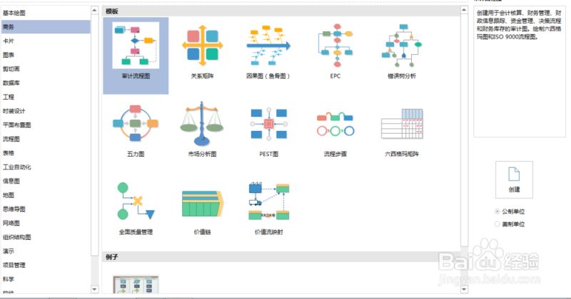 2、第二步,选择商务分类模板中的“审计流程图”,然后点击“创建”,如下图所示: