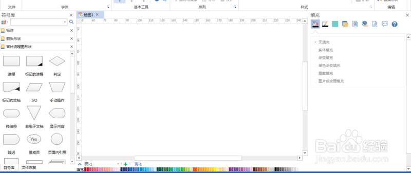 3、第三步,创建空白的画布“绘图1”,左侧是标注、箭头形状和审计流程图形状,如下图所示: