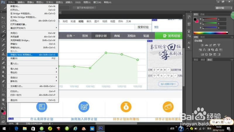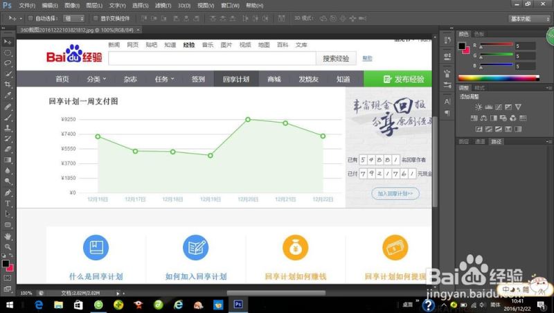 1、在这里,我借用百度经验的主页来给大家演一下(嘻嘻)。打开photoshop,打开设计好的图片。