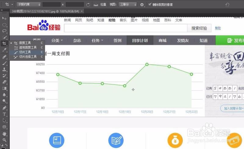 2、一般来说,我们需要使用切片工具将它分为几个区域。一方面网页不至于过大而难以加载,另一方面也方便在dreamweaver中按区域来修改。